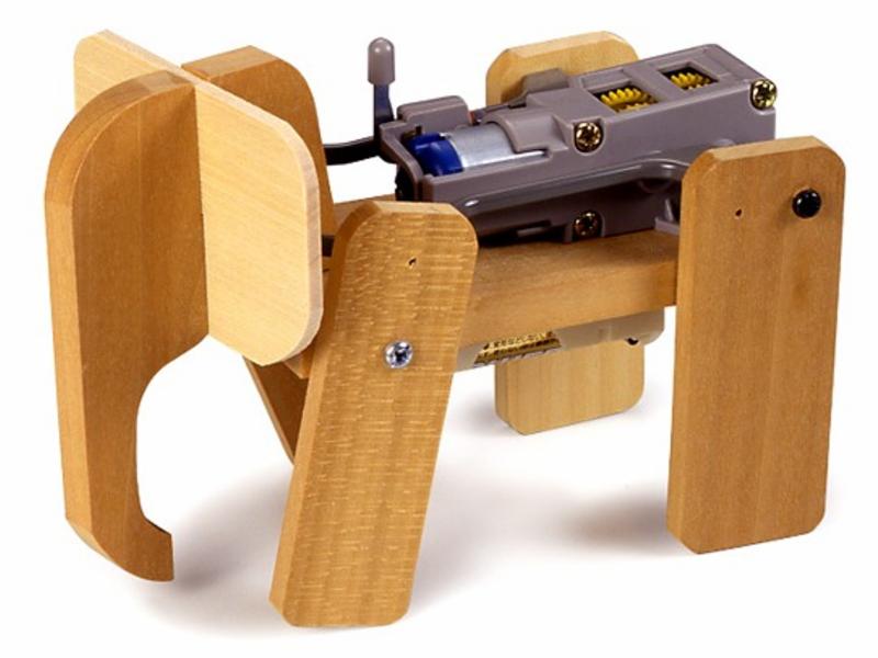 This model mimics the movement of an elefant as it swings its head from side to side while lumbering forward. The legs, head, and ears are pre-cut wooden parts which can be easily assembled with screws. The gears and gearbox are made from durable reinforced plastic to deliver reliable performance. Link rods which extend forward push the ears in time with the leg movement to result in the head’s left/right motion.