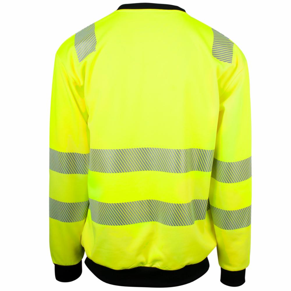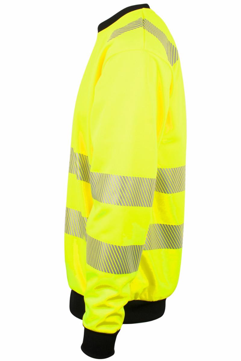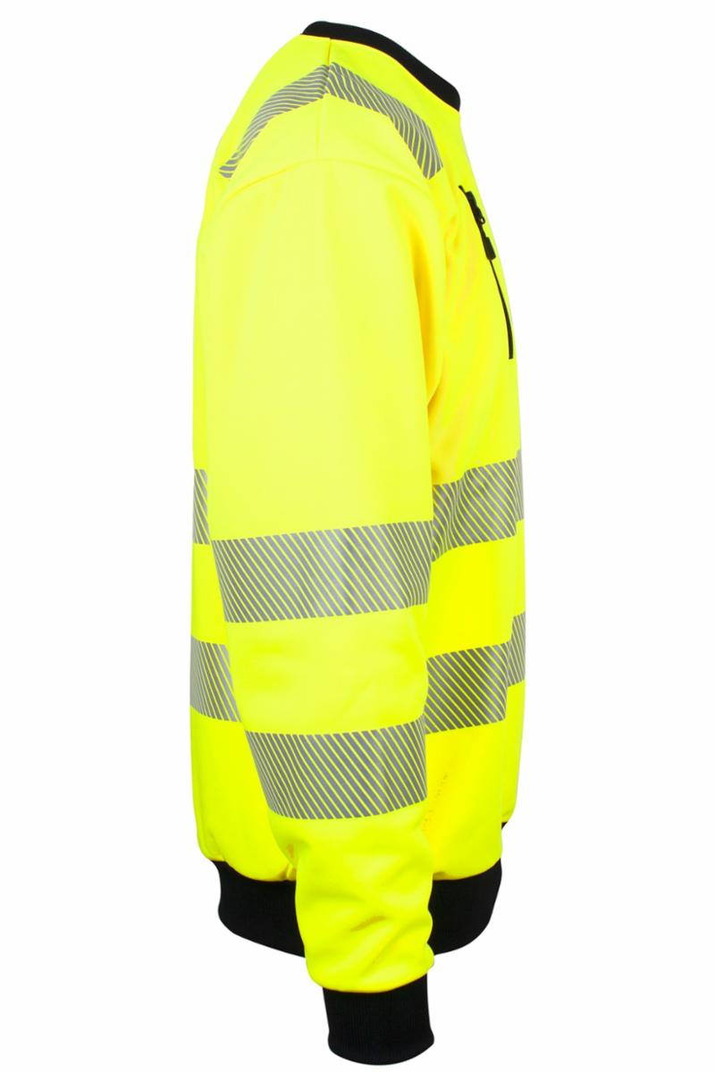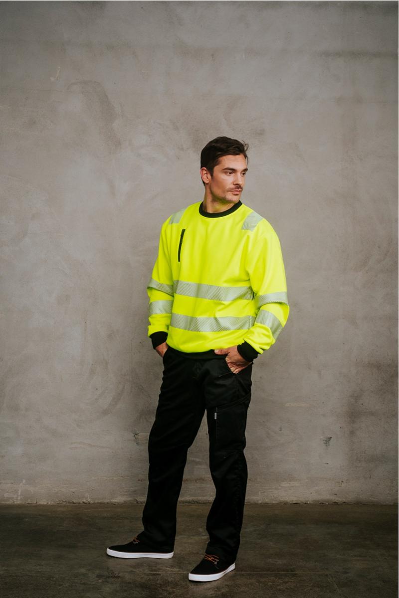 Unisex Pro-Dry behandlet sweatshirt i fluoriserende gul som gjør deg ekstra synlig. Elastiske reflekser rundt midje, på ermer og over skuldre sørger for at du er godt synlig i omgivelsene. Sorte kontraster i hals, linning og ermer. Brystlomme med glidelås. CE-merket. EN 20471, klasse 3.