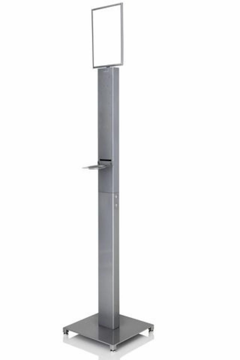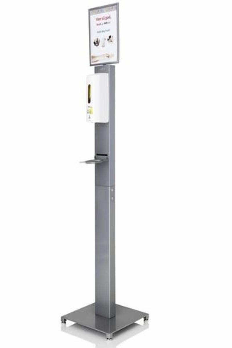 Gulvstativet innbyr til hånddesinfeksjon og god håndhygiene for forbipasserende
