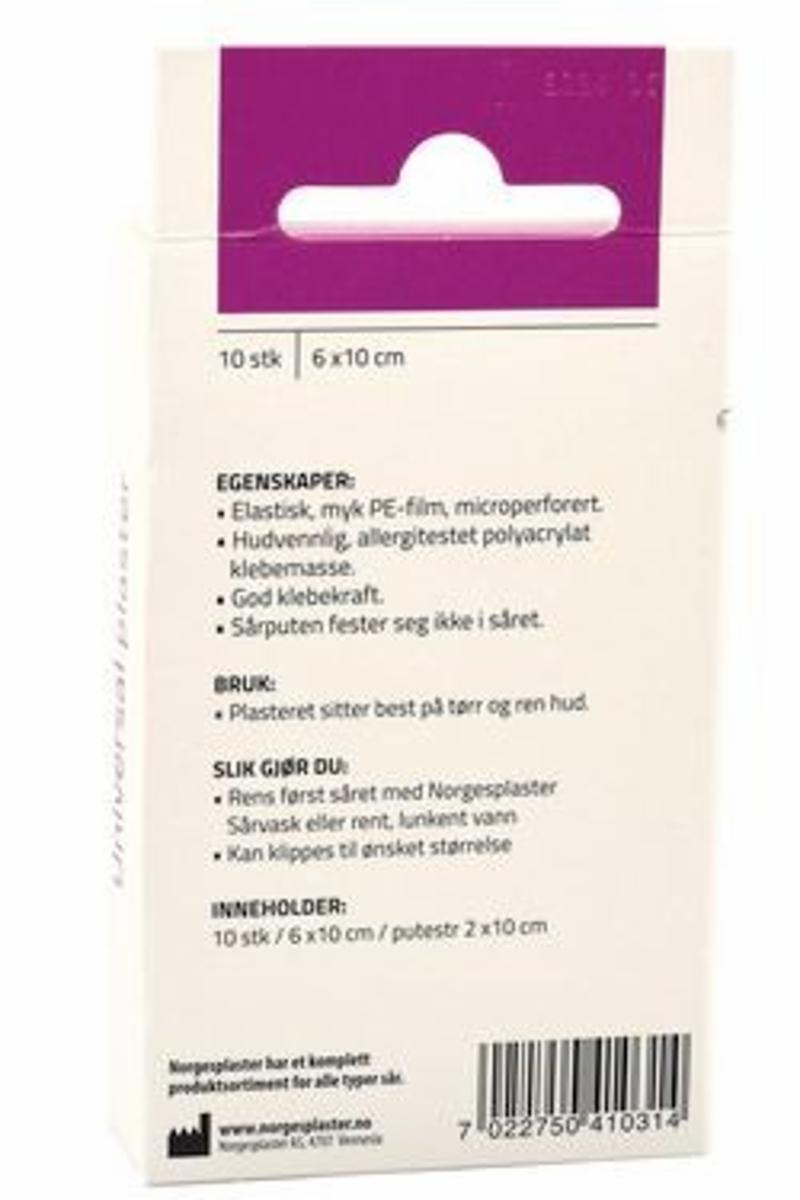Dette vannavstøtende universalplasteret er perfekt til mindre kutt, rifter og sår. Plasteret kan klippes til ønsket størrelse og puster. Limen er allergitestet, og sårputen fester seg ikke i såret. Plasteret fås i størrelsen 60 x 100 mm og har god klebekraft. Det er fint å ha i medisinskapet dersom uhellet skulle være ute.