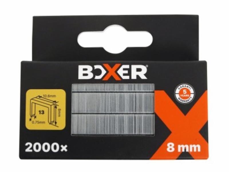 BOXER® stifter type 13 i galvanisert tråd. Høyde på stifteben: 8 mm Eske med 16 klammerrekke à 125 stk. = 2000 klammere i alt.
