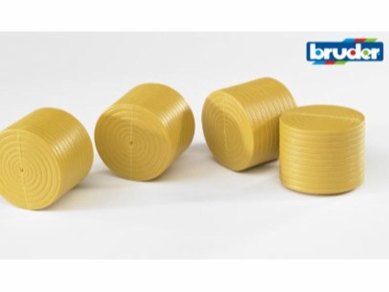 De fire rundballene (lysebrun), ikke plastet, passer bland annet til CLAAS Rollant 250 rundballepresse