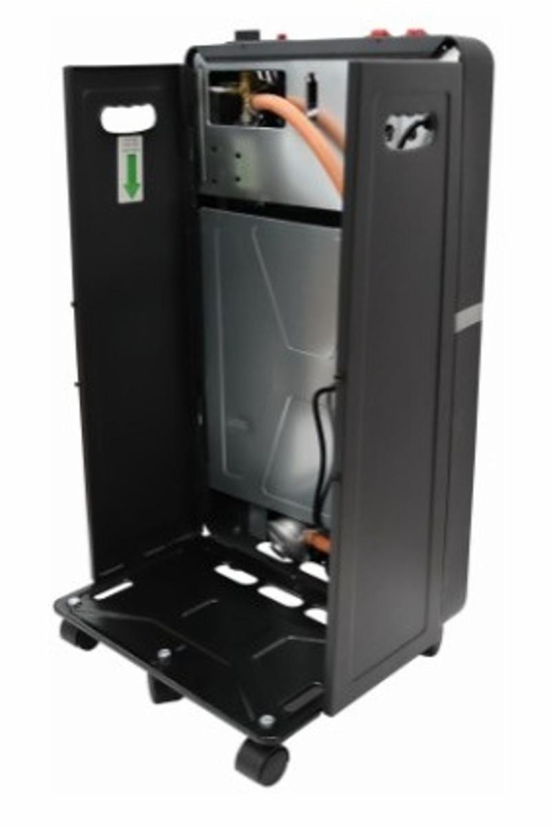 Du kan bruke en gassovn i alle typer rom, og den behøver ikke avtrekk. Gassvarmeovnen får raskt romtemperaturen til å stige. Men du må være oppmerksom på at forbrenning av gass gir en del kondens og kan gjøre luften tung, og som ved all forbrenning oppstår det partikkelforurensning som kan være helseskadelig, så sørg jevnlig for grundig utluftning. Sammenleggbar gassvarmeovn med 3 infrarøde varmeelementer og innebygd elektrisk varmevifte.