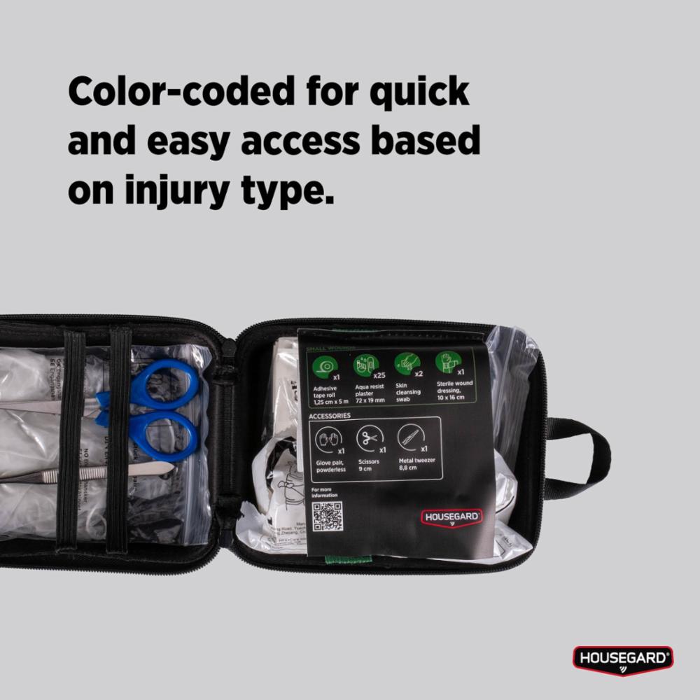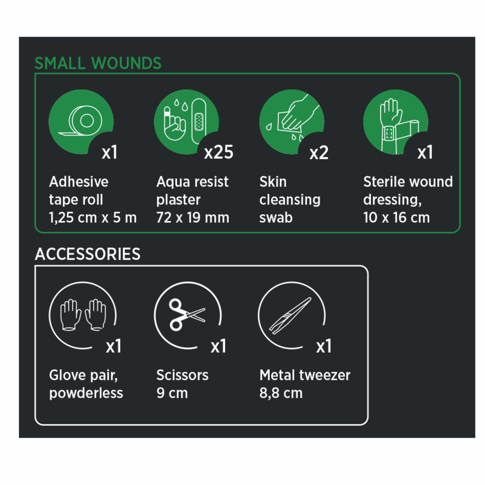 En kompakt førstehjelpsveske med det viktigste for små sår og mindre skader. Vesken inneholder 32 deler for grunnleggende behandling, og tydelig fargekoding gjør det enkelt å finne riktig utstyr når det trengs.