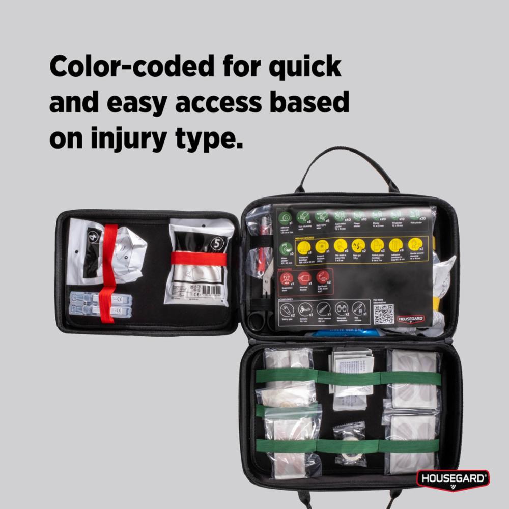 - Inneholder alt som trengs for å håndtere både små og større skader