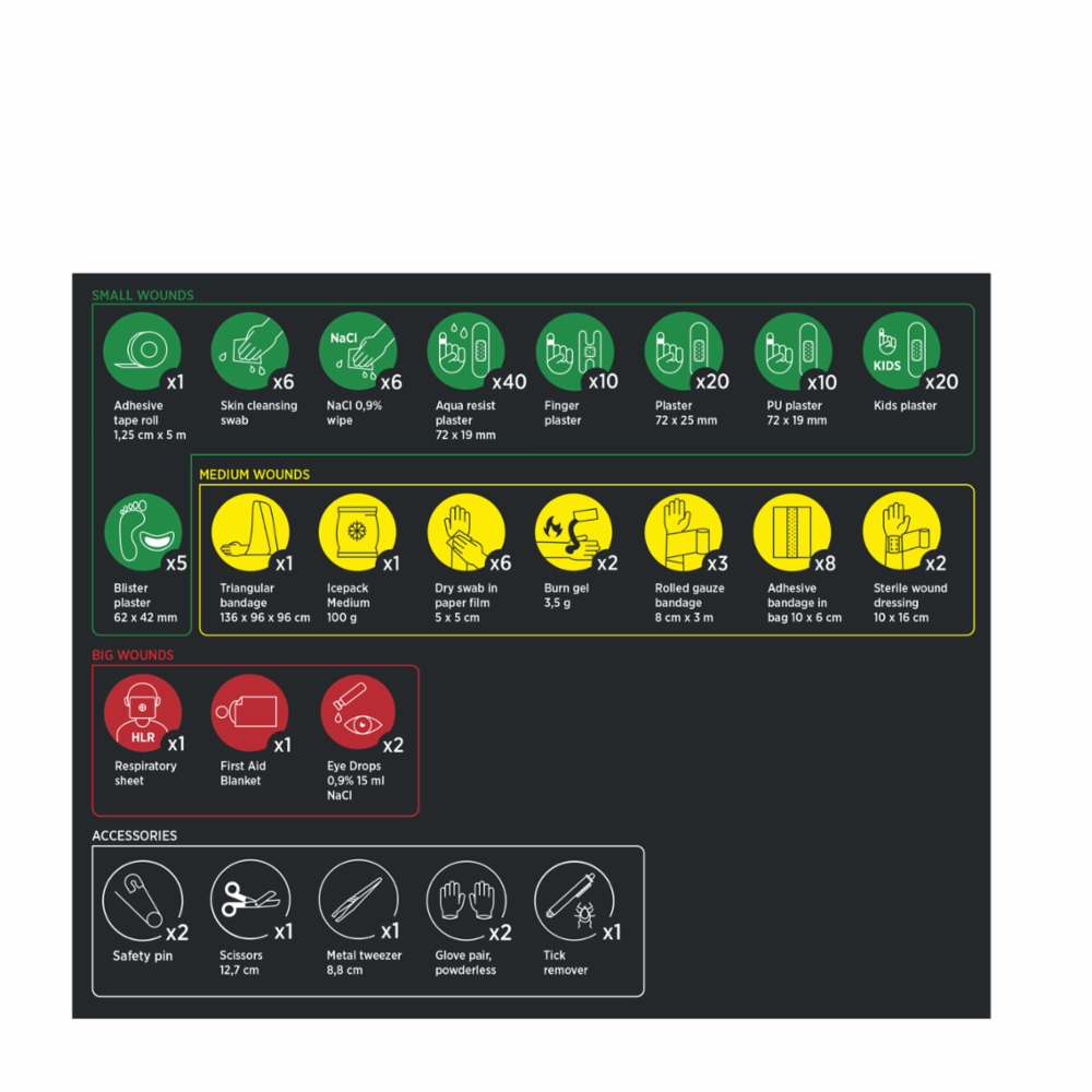 Med 152 deler er denne vesken spesielt tilpasset for den som ønsker å være ekstra forberedt. Den inneholder både vanlige bandasjematerialer og spesifikke produkter for øyepleie, samt livredningsutstyr som munn-til-munn maske og redningsteppe.