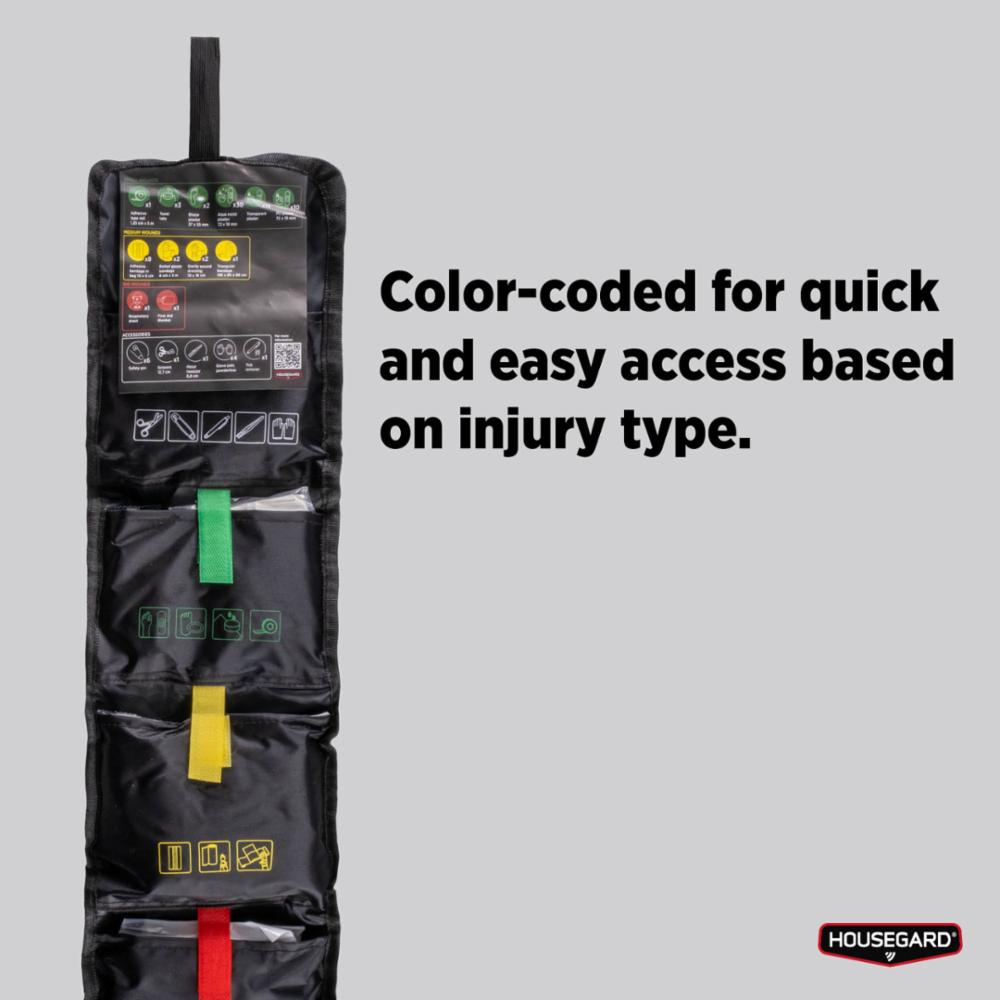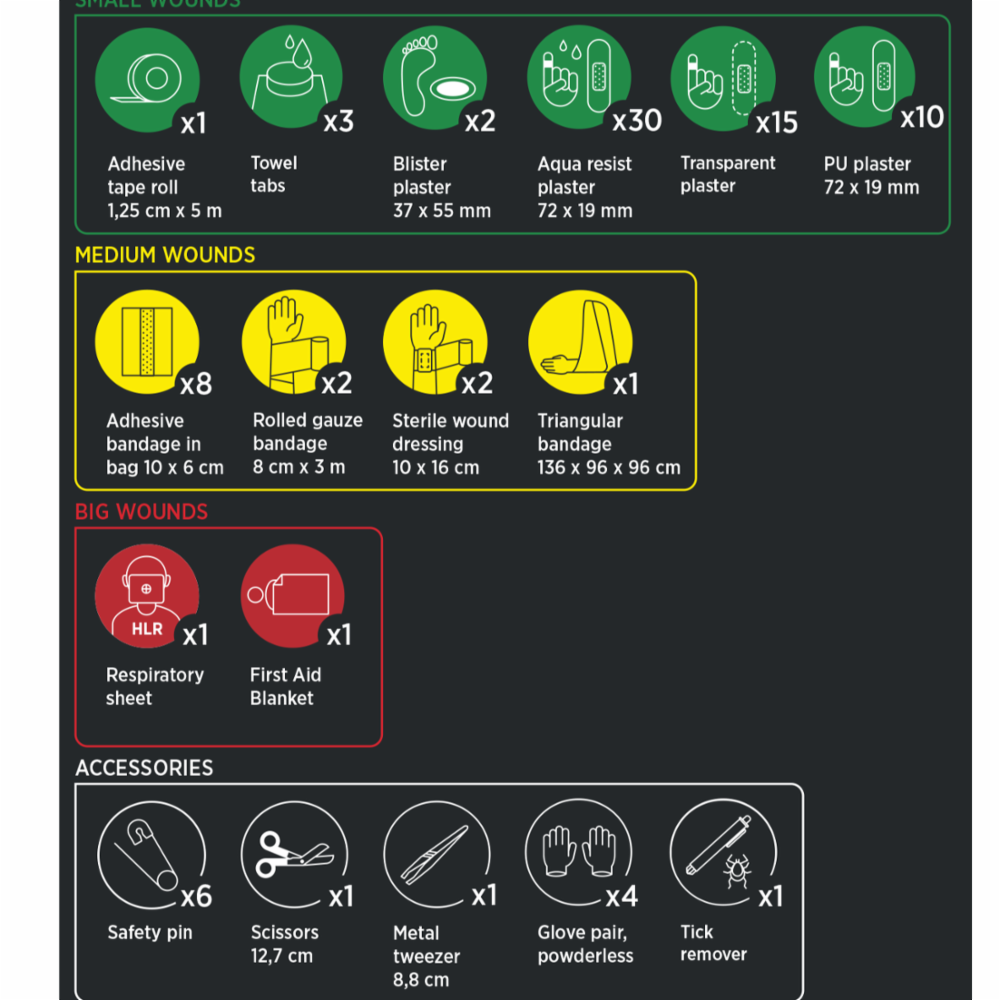 Med 89 deler dekker vesken grunnleggende behov for raskt å kunne gi førstehjelp i nødsituasjoner. Munn-til-munn maske og redningsteppe gjør den spesielt nyttig ved større ulykker, og du kan være trygg på at alle bandasjer, kompresser og utstyr holder seg tørre og effektive.