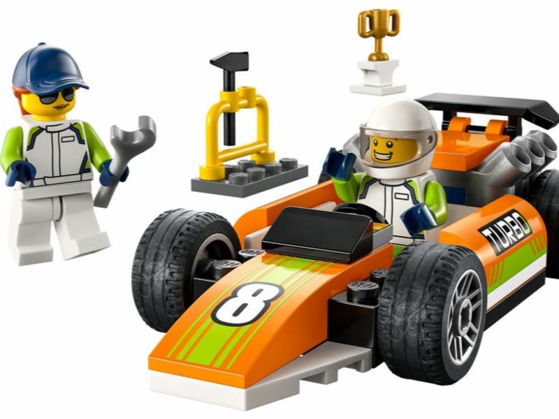 • Hva inneholder esken? Alt barn trenger for å bygge en lekeracerbil, samt en vinnerpokal, verktøy og minifigurer av en mekaniker og en sjåfør