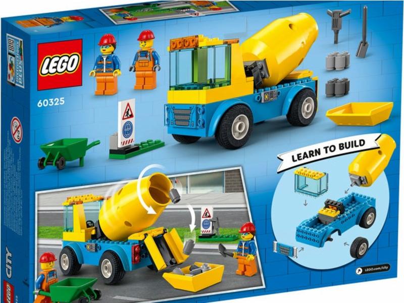 • Hva inneholder esken? Alt barn trenger for å bygge modellen LEGO® City Betongblander, samt en trillebår, trykkluftbor, veiarbeidsskilt og to minifigurer av anleggsarbeidere