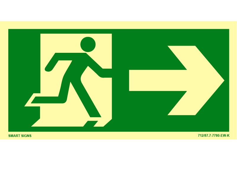 Etterlysende høyluminans markeringsskilt med symbol løpende mann og pil høyre.