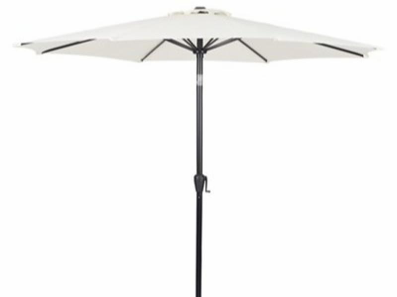 Parasoll med tilt og sveiv Ø3M Parasoll Felix 3m sort, med sveiv og mulighet til å tilte. Helningen/tiltingen på parasollen kan ikke justeres. Parasollen er lett å slå sammen. Det følger ikke med parasollfot. Parasollen har en diameter på 3m. Parasollduken er laget i 180g/m² polyester. PA coating Høyde 2,5m og rørtykkelse 48mm. det er 8 metallribber i duken. --- Farge: beige Materiale: aluminium og polyester. Rørtykkelse: 48mm Med sikkerhetsutlufting i toppen