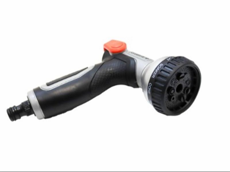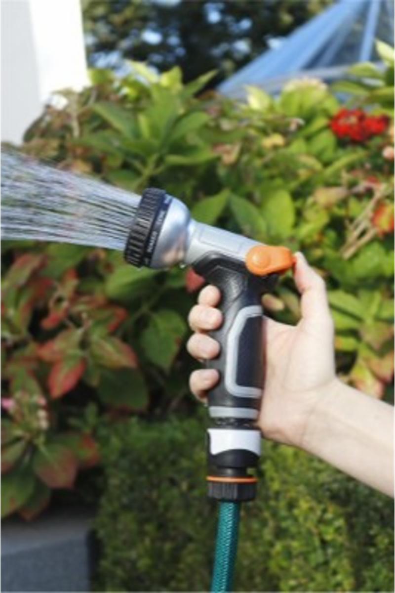 Ergonomisk, funksjonelt, praktisk er en kortbeskrivelse av denne sprøytepistolen, den har også 9 sprayfunksjoner og regulering i moderne og spennende design. Den regulerbare dusjpistolen fungerer med både lavt og høyt vanntrykk. Vanngjennomstrømningen kan lett justeres ved hjelp av en tommelfingerbetjent bøyle.